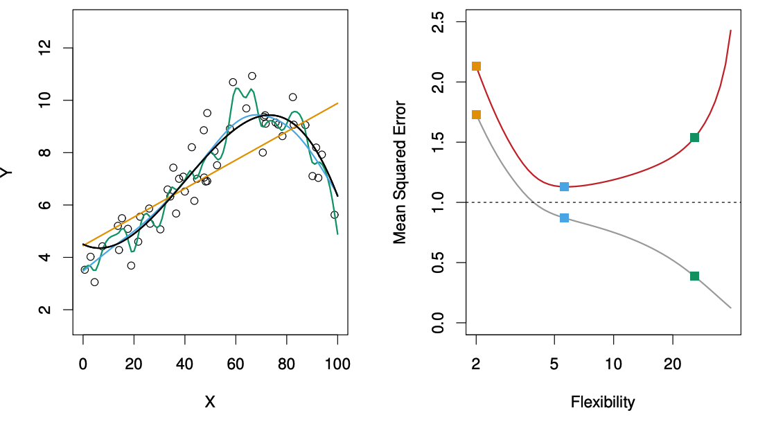 이와 같이 분산과 편향 사이에는 모델이 너무 복잡하면 분산이 증가하고, 모델이 너무 단순하면 편향이 증가하는 trade-off 관계가 있습니다. 적절한 모델의 복잡도를 찾기 위해서는 이후 살펴볼 교차 검증(Cross-validation)과 같은 방법을 사용하면 됩니다.